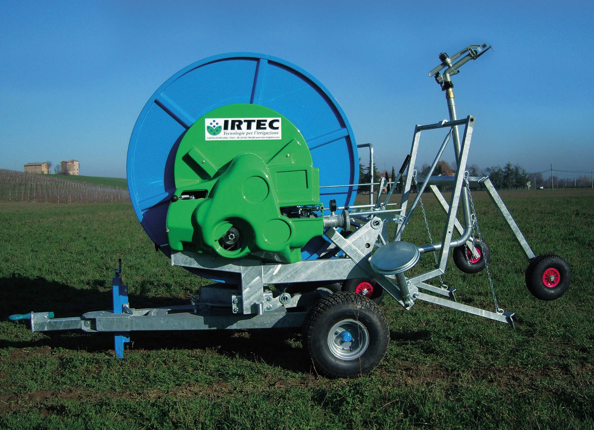 Galvanised raingun trolley mounted on adjustable variable track wheels for versatile field operation.