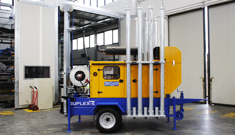 The Nettuno DUPLEX motor pumps are equipped with the latest control units for monitoring motor parameters, alternator, and surface pump operations. Additional features include an emergency stop button, frequency control potentiometer, electric power winch, and the possibility of remote control via SMS for starting the automatic cycle.